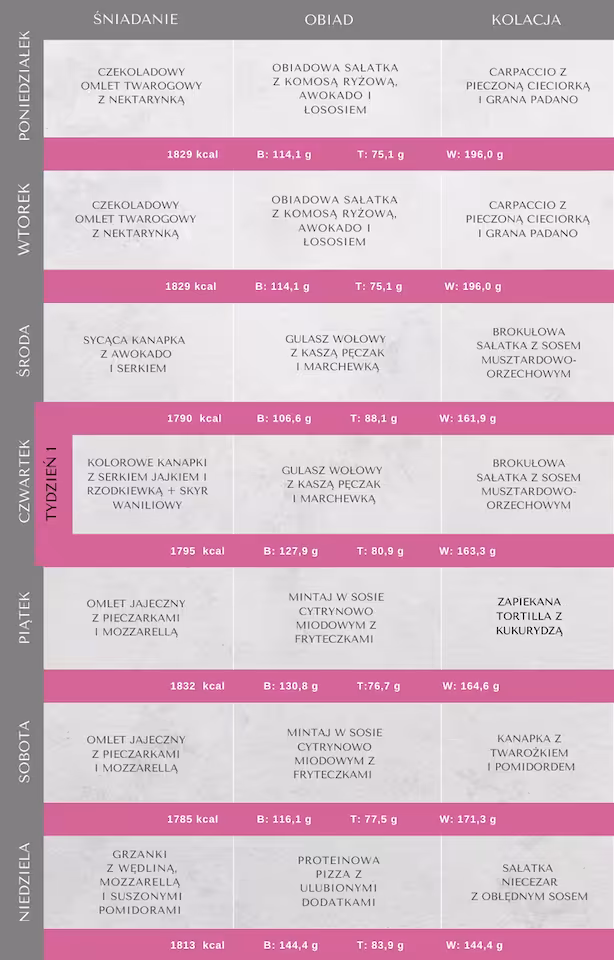 🌸 rozkład makroskładników: Białko: 25 %, Tłuszcz: 40 %, Węglowodany: 35 %