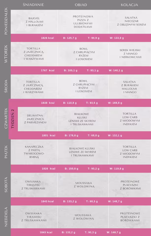🌸 rozkład makroskładników: Białko: 25 %, Tłuszcz: 40 %, Węglowodany: 35 %
